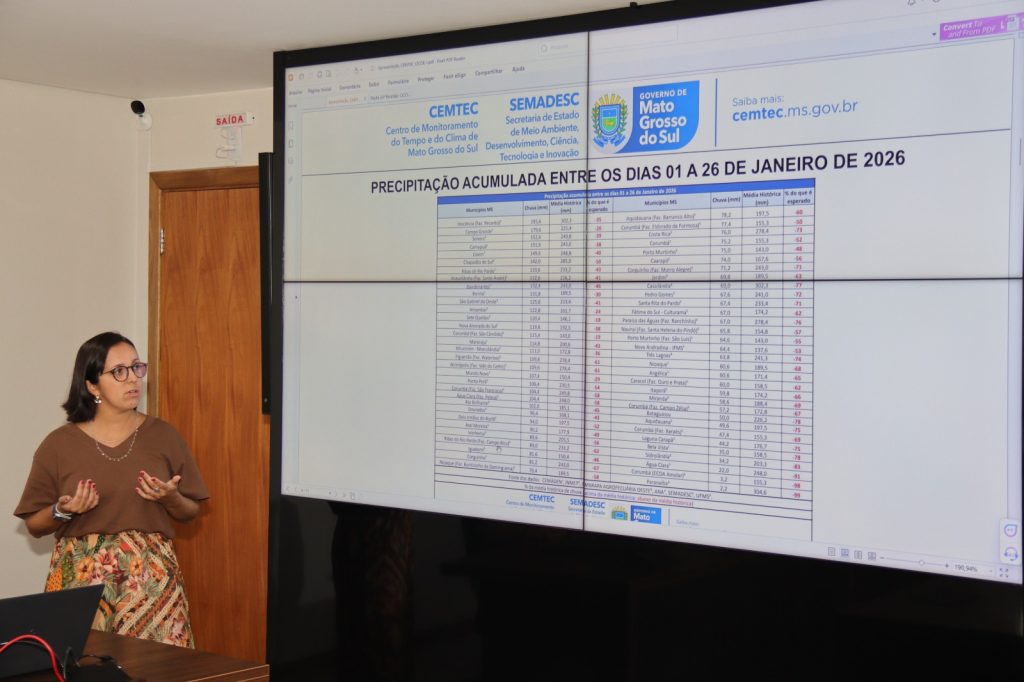 Em geral, o mês de janeiro apresentou 30% menos chuva do que a média histórica na região do Pantanal. Levantamento do Cemtec/MS mostra que, entre 1º e 26 de janeiro, nenhum dos pontos monitorados pela rede de estações meteorológicas do Estado alcançou a média histórica de chuvas. Em localidades como na Serra do Amolar, em Corumbá, o nível de chuvas está 98% abaixo do esperado. Em Paranaíba, região do Bolsão, 99% abaixo.